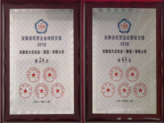 安徽省大名實業(yè)(集團)有限公司榮獲安徽省民營企業(yè)營收百強排名第63位!安徽省民營企業(yè)納稅百強排名第24位!