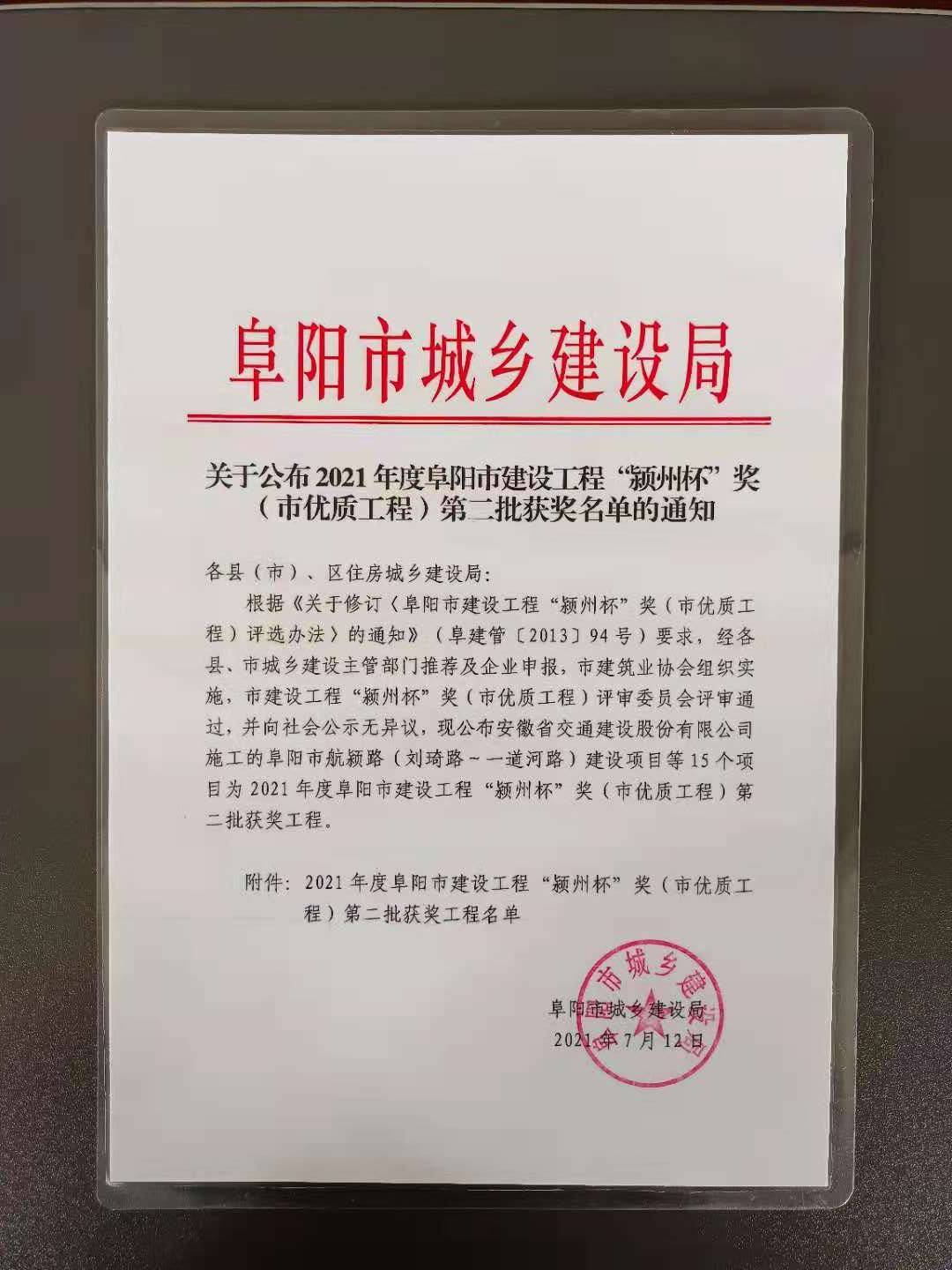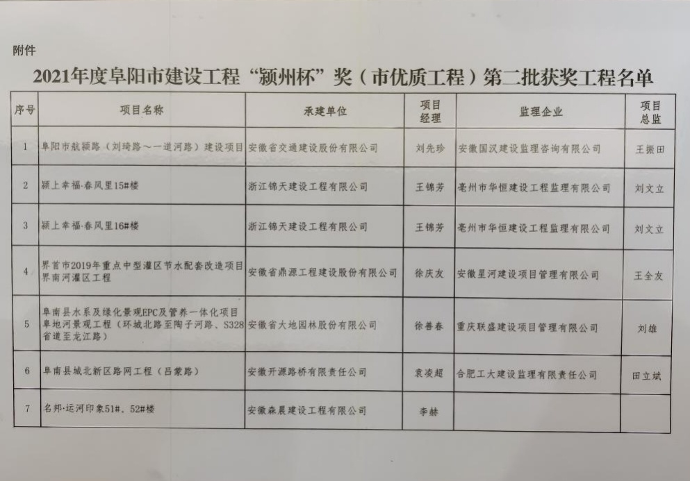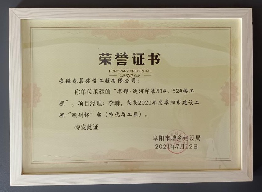 2021年7月12日,經(jīng)過一系列嚴(yán)格的工程質(zhì)量評比,阜南名邦•運(yùn)河印象51#、52#樓榮獲2021年度阜陽市建設(shè)工程“潁州杯”獎(jiǎng)(市優(yōu)質(zhì)工程),為名邦地產(chǎn)在阜陽地區(qū)市場的良好口碑再添新獎(jiǎng)。