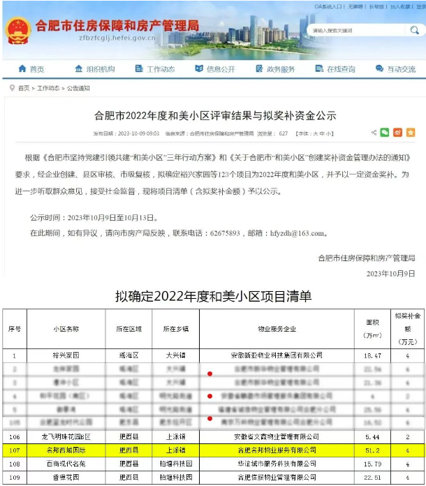 2023年10月9日,合肥市房產(chǎn)局在官網(wǎng)發(fā)布,合肥市2022年度和美小區(qū)評審結(jié)果與擬獎(jiǎng)補(bǔ)資金,公示全市123個(gè)小區(qū)擬確定為2022年度和美小區(qū)。公示顯示,名邦·西城國際小區(qū)入選和美小區(qū)。