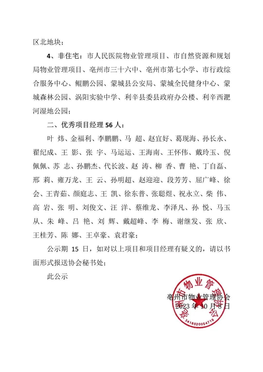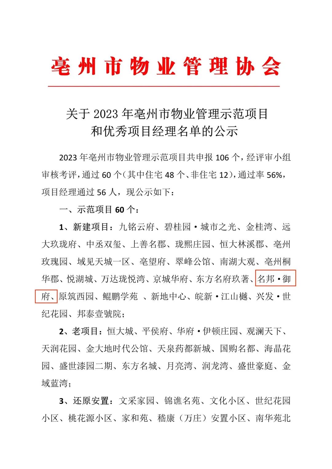 2023年10月8日,亳州市物業(yè)管理協(xié)會發(fā)布《關(guān)于2023年亳州市物業(yè)管理示范項(xiàng)目和優(yōu)秀項(xiàng)目經(jīng)理名單的公示》,蒙城名邦·御府項(xiàng)目榮獲“市優(yōu)”稱號。