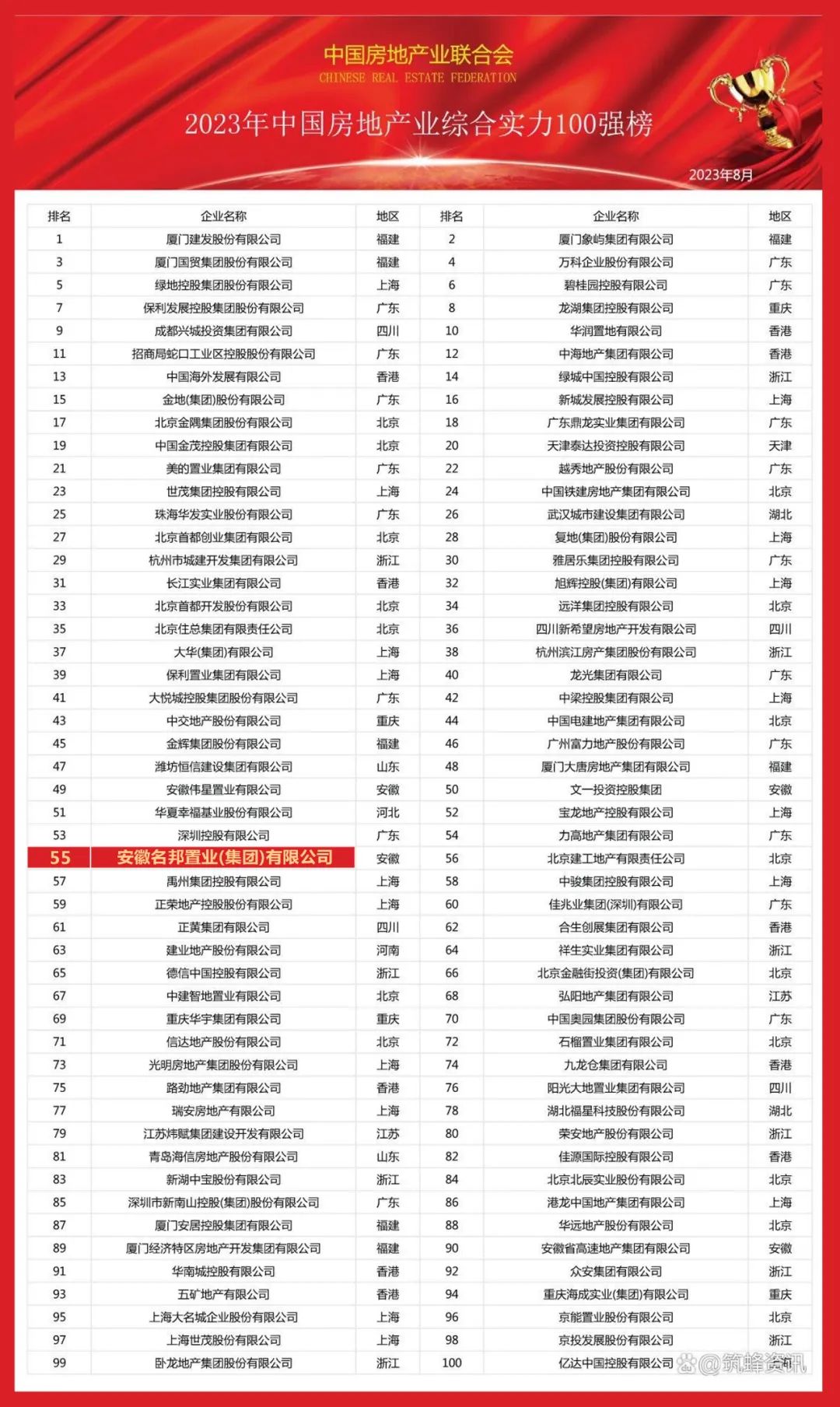 近期,中國(guó)房地產(chǎn)業(yè)聯(lián)合會(huì)發(fā)布了“2023年中國(guó)房地產(chǎn)業(yè)綜合實(shí)力100強(qiáng)榜單”。安徽名邦置業(yè)(集團(tuán))有限公司憑借高質(zhì)量的穩(wěn)健發(fā)展,榮登TOP55,成為中國(guó)百?gòu)?qiáng)房企中堅(jiān)代表。至此,安徽名邦置業(yè)(集團(tuán))有限公司已連續(xù)7年榮登榜單,且名次逐年上升。