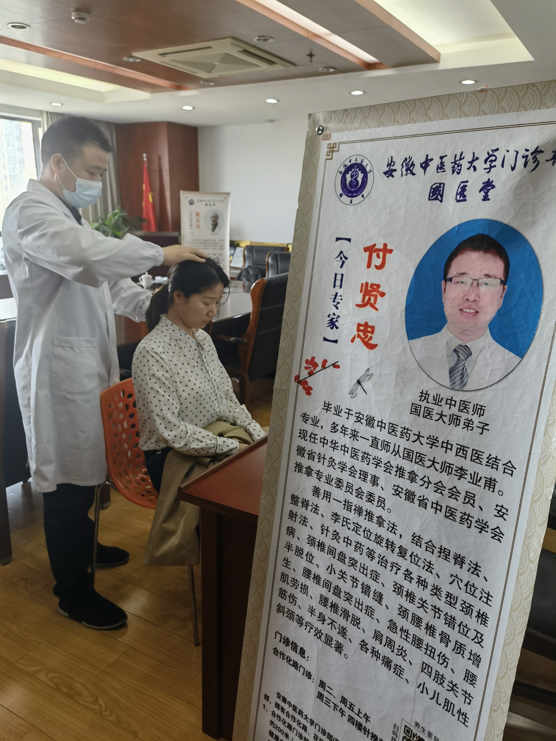 頸椎病、腰椎病、肩周炎是辦公室亞健康常見病,因此問診的員工最多,付賢忠醫(yī)師、胡明醫(yī)師耐心地位每一位員工講授中醫(yī)推拿知識,示范中醫(yī)肩頸推拿按摩手法,為現(xiàn)場大名員工提供中醫(yī)診療。