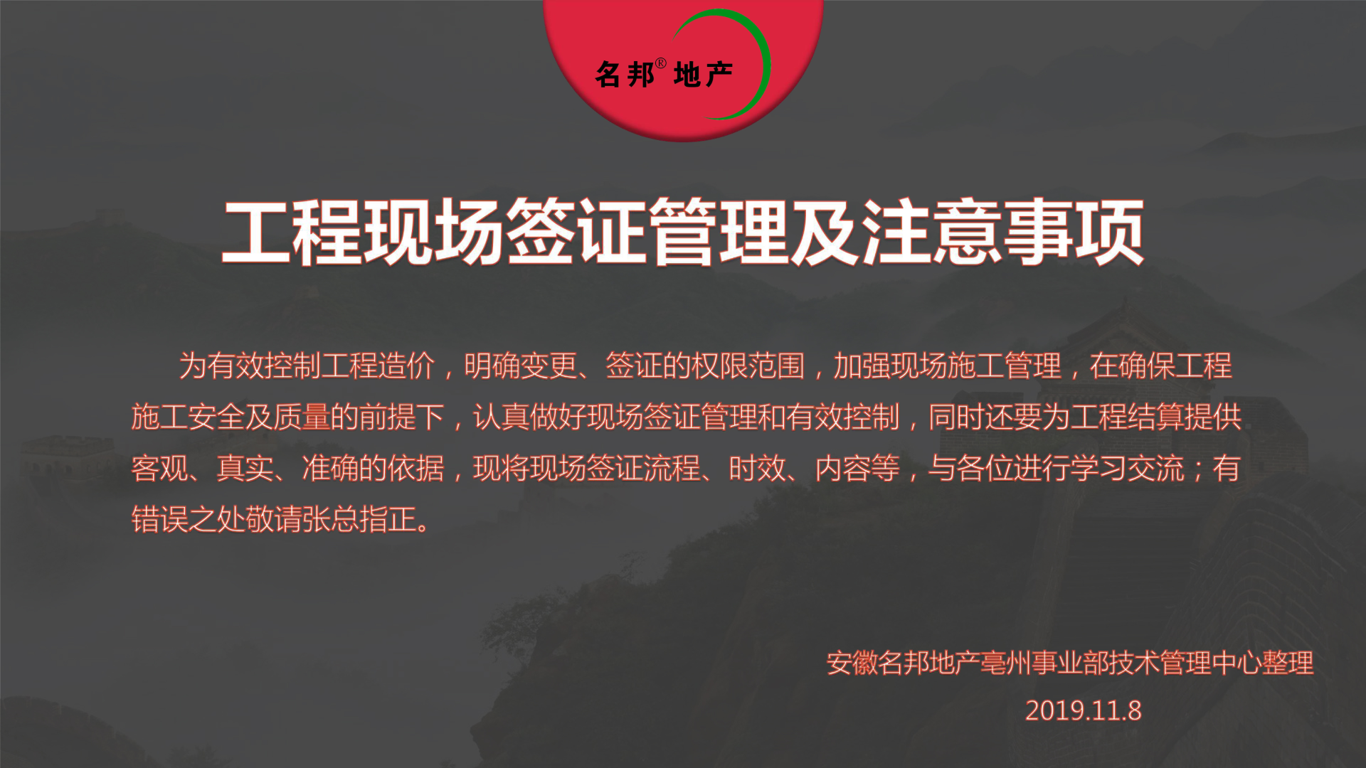 為進(jìn)一步提高名邦地產(chǎn)工程管理人員的專業(yè)水平和業(yè)務(wù)素養(yǎng),名邦置業(yè)集團(tuán)于2019年11月14日在亳州事業(yè)部召集組織了為期半天的“工程現(xiàn)場簽證管理及注意事項交流討論會”。本次交流會由名邦置業(yè)集團(tuán)副總經(jīng)理張貴主持,亳州事業(yè)部技術(shù)管理中心經(jīng)理張明萬主講,亳州事業(yè)部相關(guān)管理人員及全體工程人員參與了此次交流討論。
