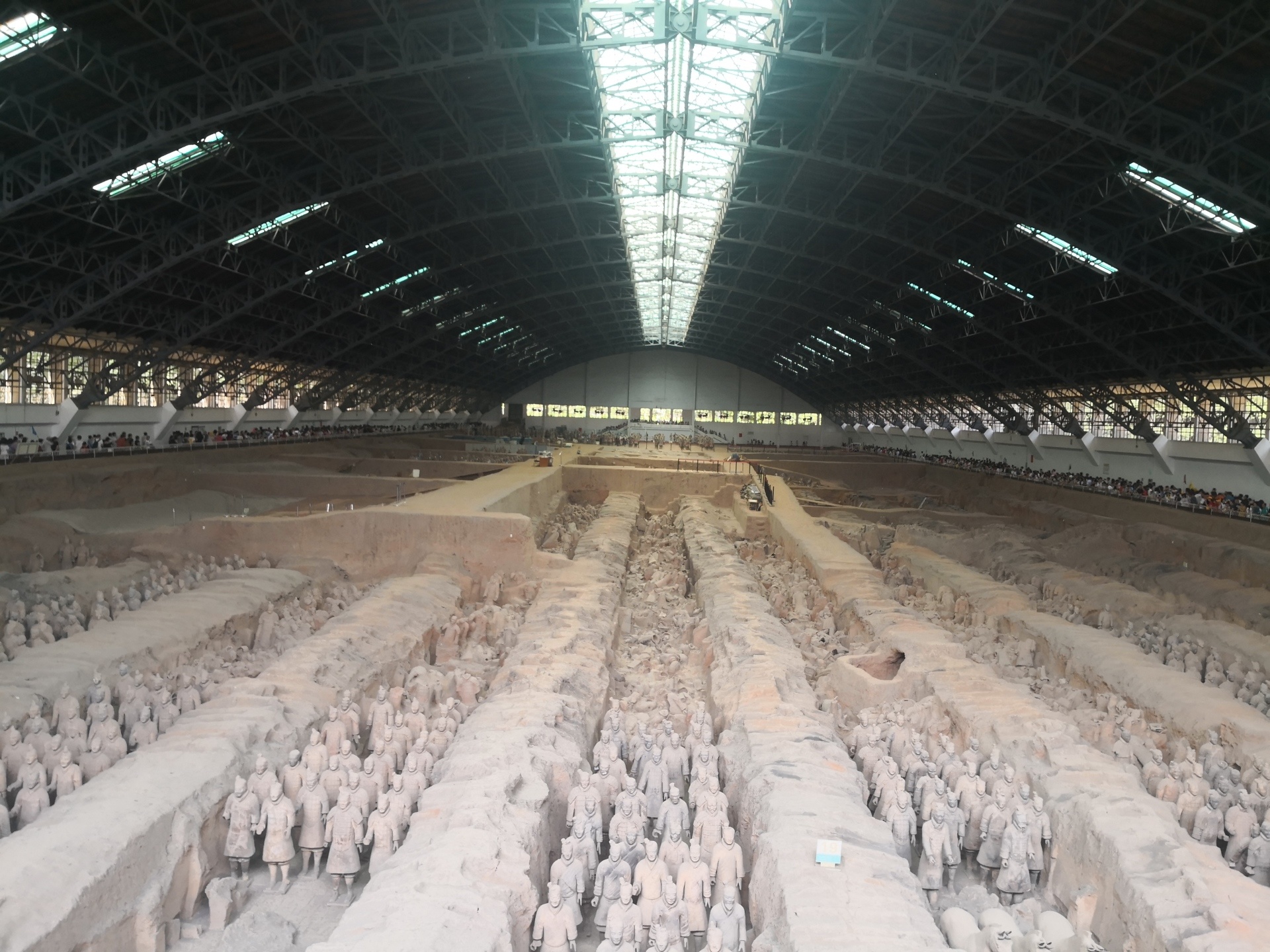 俗話說:“北京看城頭,西安看墳頭”。兵馬俑陪葬坑坐西向東,三坑呈品字形排列。最早發(fā)現(xiàn)的是一號(hào)俑坑,呈長方形,坑里有8000多個(gè)兵馬俑,四面有斜坡門道。一號(hào)俑坑左右兩側(cè)各有一個(gè)兵馬俑坑,稱二號(hào)坑和三號(hào)坑。隨之出土的還有兩個(gè)銅馬車,銅車比例與實(shí)際比例為1:2,車馬的冶金鑄造技術(shù)也令人驚嘆~坑?xùn)|端有三列橫排武士俑,手執(zhí)弓弩類遠(yuǎn)射兵器,似為前鋒部隊(duì),其后是6000鎧甲俑組成的主體部隊(duì),手執(zhí)矛、戈戟等長兵器,同35乘駟馬戰(zhàn)車在11個(gè)過洞里排列成38路縱隊(duì)。