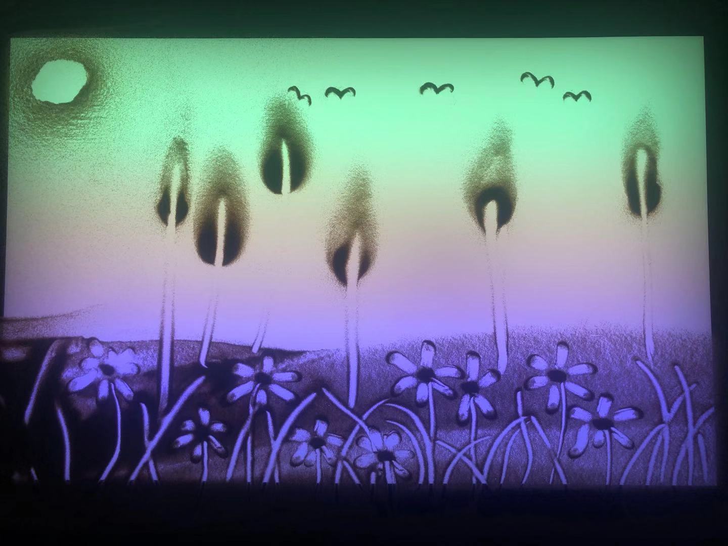 沙畫算是一門小眾藝術,大家都是第一次接觸。在沙畫老師的示范和教學下,大家也都完成了屬于自己的沙畫作品,還有畫沙畫中的一些技巧:例如拍太陽,拍太陽主要就是追求一種暈染的效果,讓太陽有光的朦朧感,這就要求下手干凈利落,用力均勻,只能拍一下,一拍成型!