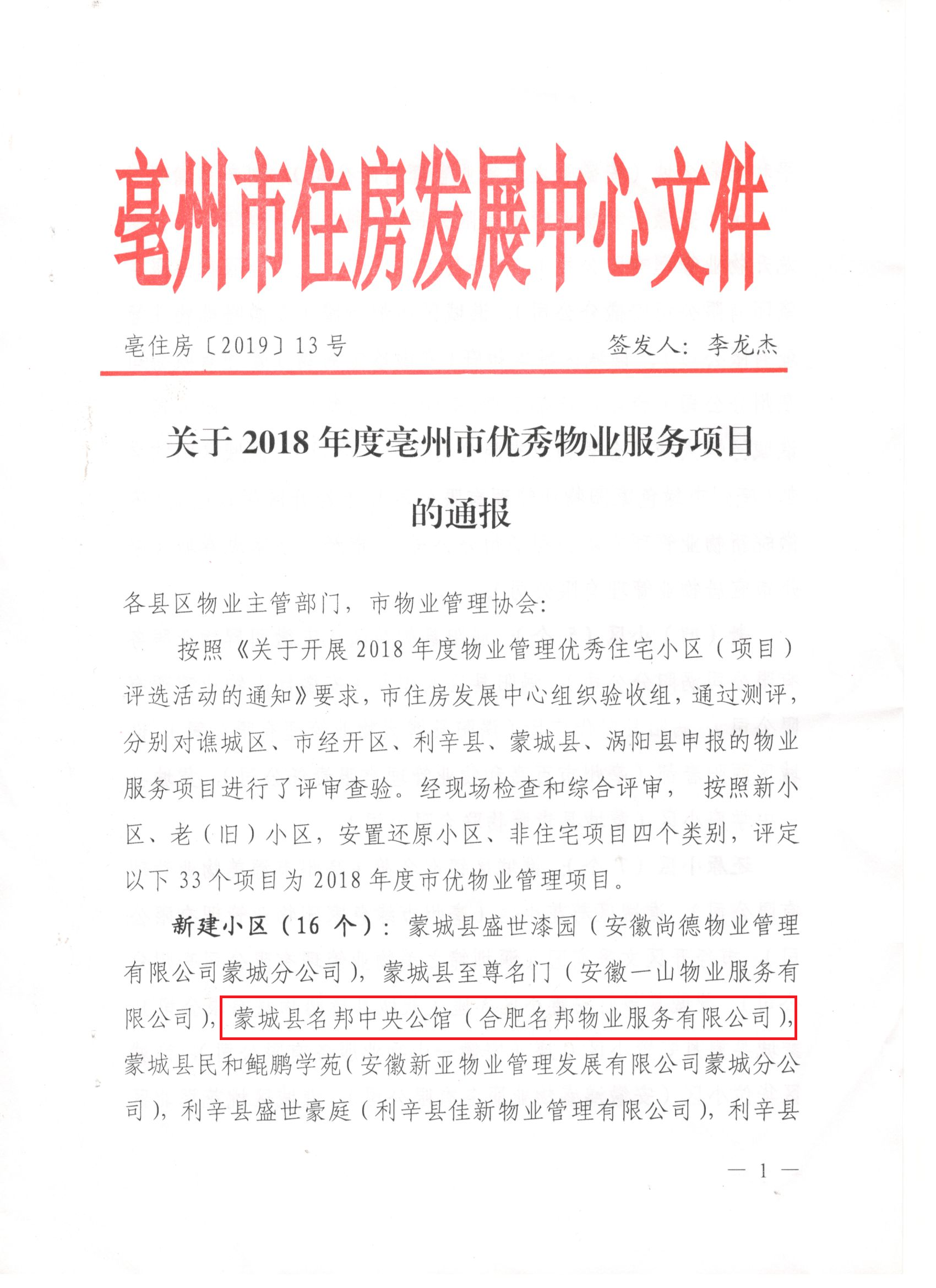 蒙城名邦·中央公館榮獲“亳州市物業(yè)管理優(yōu)秀住宅示范小區(qū)”稱號(hào)