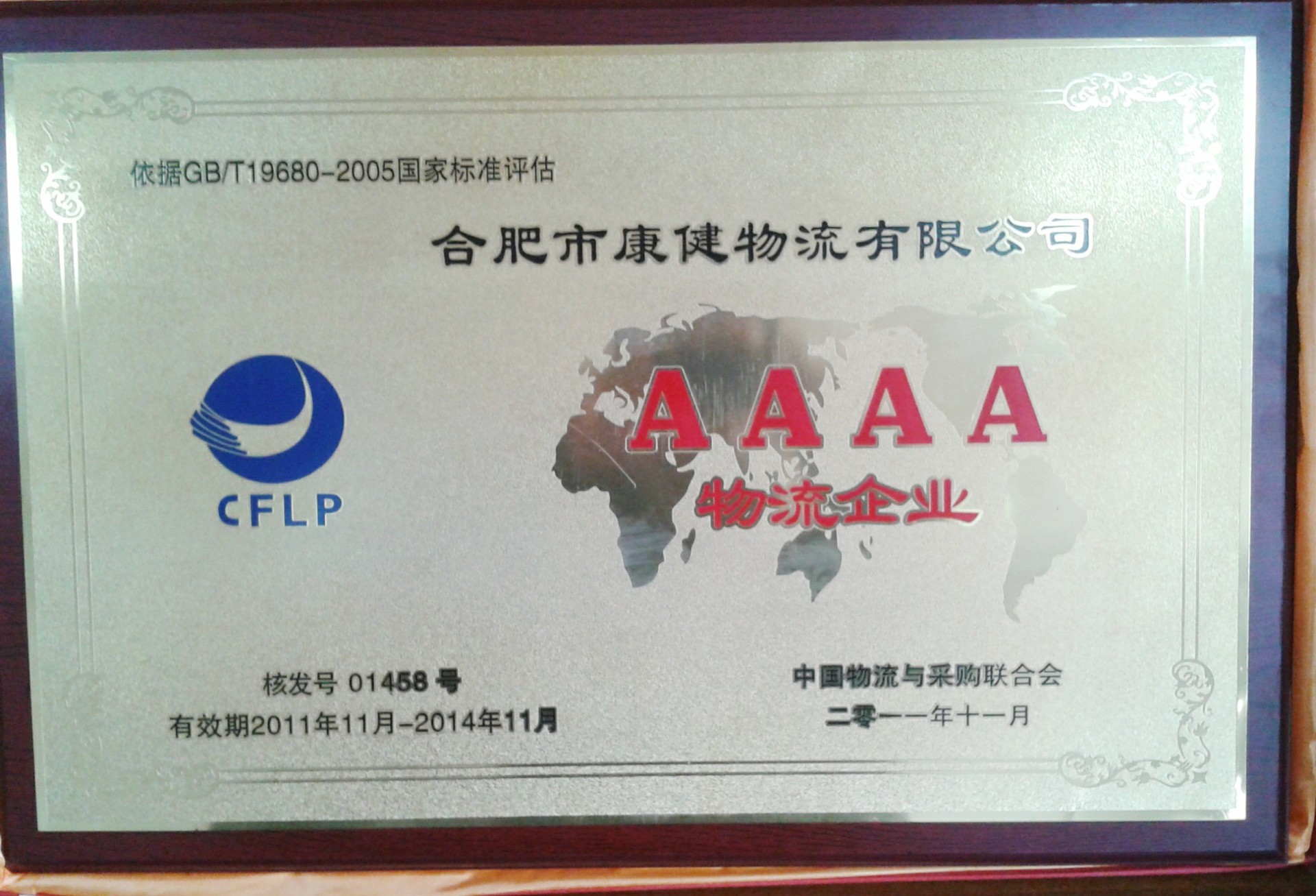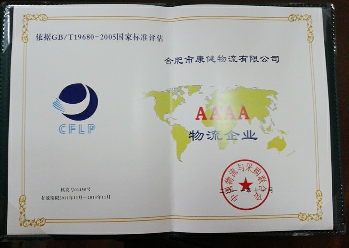 2011年9月24日康健物流通過中國(guó)物流與采購(gòu)聯(lián)合會(huì)物流企業(yè)綜合評(píng)估委員會(huì)“4A級(jí)綜合服務(wù)型物流企業(yè)”的現(xiàn)場(chǎng)評(píng)估和審核,同年12月19日在北京國(guó)家會(huì)議中心獲得證書和授牌。