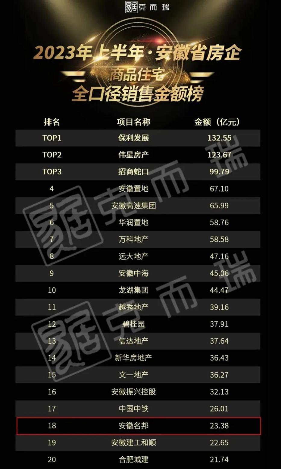 在克而瑞發(fā)布的“2023年上半年安徽省房企全口徑銷售金額榜單”、“2023年上半年安徽省房企權(quán)益銷售金額榜單”中,安徽名邦地產(chǎn)雙雙上榜,實(shí)現(xiàn)了自身的全面高質(zhì)量發(fā)展。其中權(quán)益榜單上,名邦地產(chǎn)以23.38億元銷售額榮登安徽房企TOP20榜,更彰顯了名邦立足合肥、布局安徽穩(wěn)健發(fā)展的戰(zhàn)略優(yōu)勢。