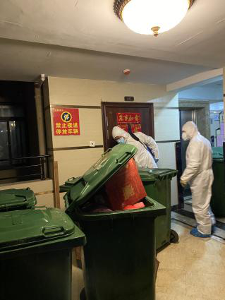 晚八點(diǎn)開始,抗疫工作小組成員的身影將在樓棟里交錯(cuò)停留近4小時(shí),他們將生活垃圾從頂層至一樓逐一清運(yùn),清運(yùn)后的垃圾桶運(yùn)至樓下進(jìn)行消毒,垃圾傾倒后再次進(jìn)行消毒。為避免交叉感染,該棟樓垃圾桶實(shí)行“專桶專用”,與園區(qū)垃圾桶區(qū)分存放。
