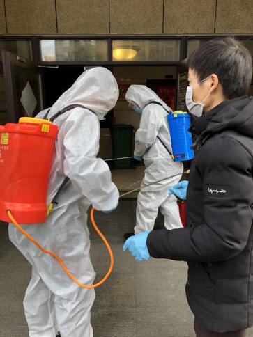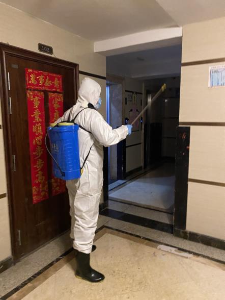 每日垃圾清運(yùn)結(jié)束,由專人負(fù)責(zé)本棟樓的消毒工作(包含走廊、電梯轎廂、單元門廳等),對(duì)隔離區(qū)域的各個(gè)角落反反復(fù)復(fù)仔細(xì)消毒。