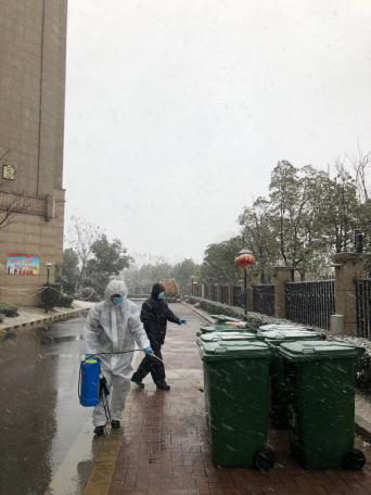 2月15日,天空陰沉沉的,合肥上空飄起了雪花,但是名邦物業(yè)人的腳步絲毫沒(méi)有停下來(lái)。他們無(wú)心欣賞窗外的雪景,一個(gè)接著一個(gè)頂著風(fēng)雪走向五號(hào)樓,他們太忙了,因?yàn)橛薪?00位的住戶在等著他們送過(guò)來(lái)的菜下鍋,近20桶的生活垃圾等著他們清運(yùn)......