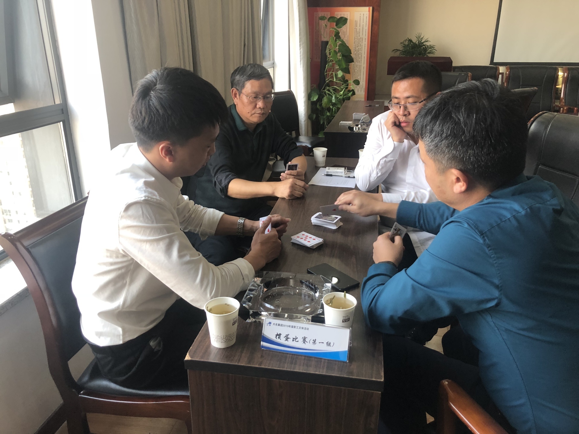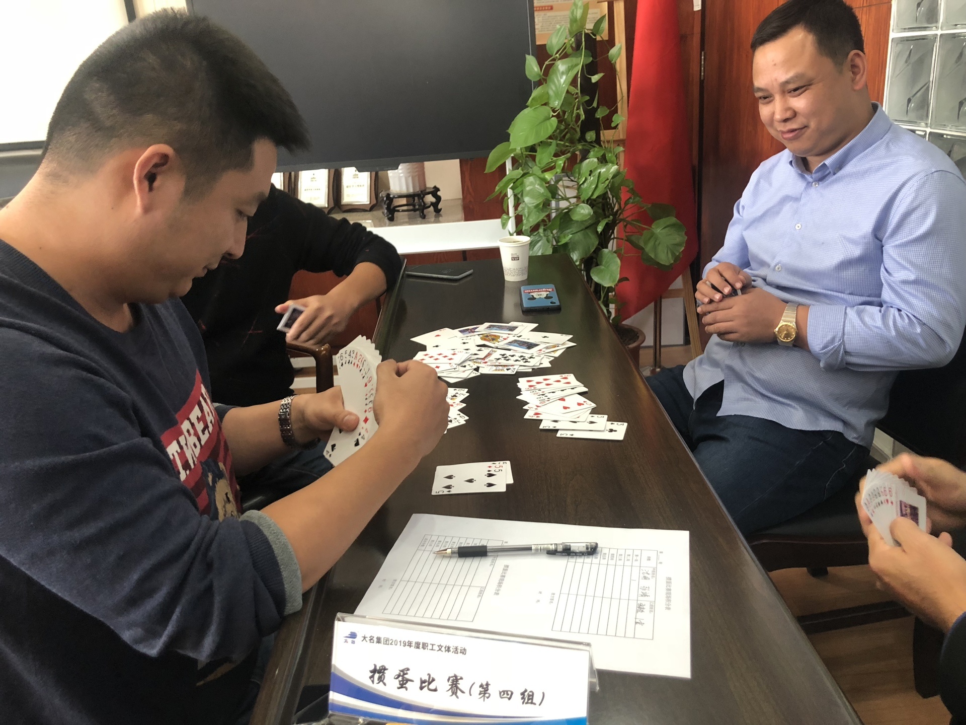 續(xù)精彩的羽毛球比賽后,牌逢對(duì)手,摜蛋會(huì)友!10月21日下午,大名集團(tuán)2019年度職工文體比賽之摜蛋比賽開(kāi)始啦!誰(shuí)會(huì)是今年大名集團(tuán)的摜蛋王呢?讓我們拭目以待!