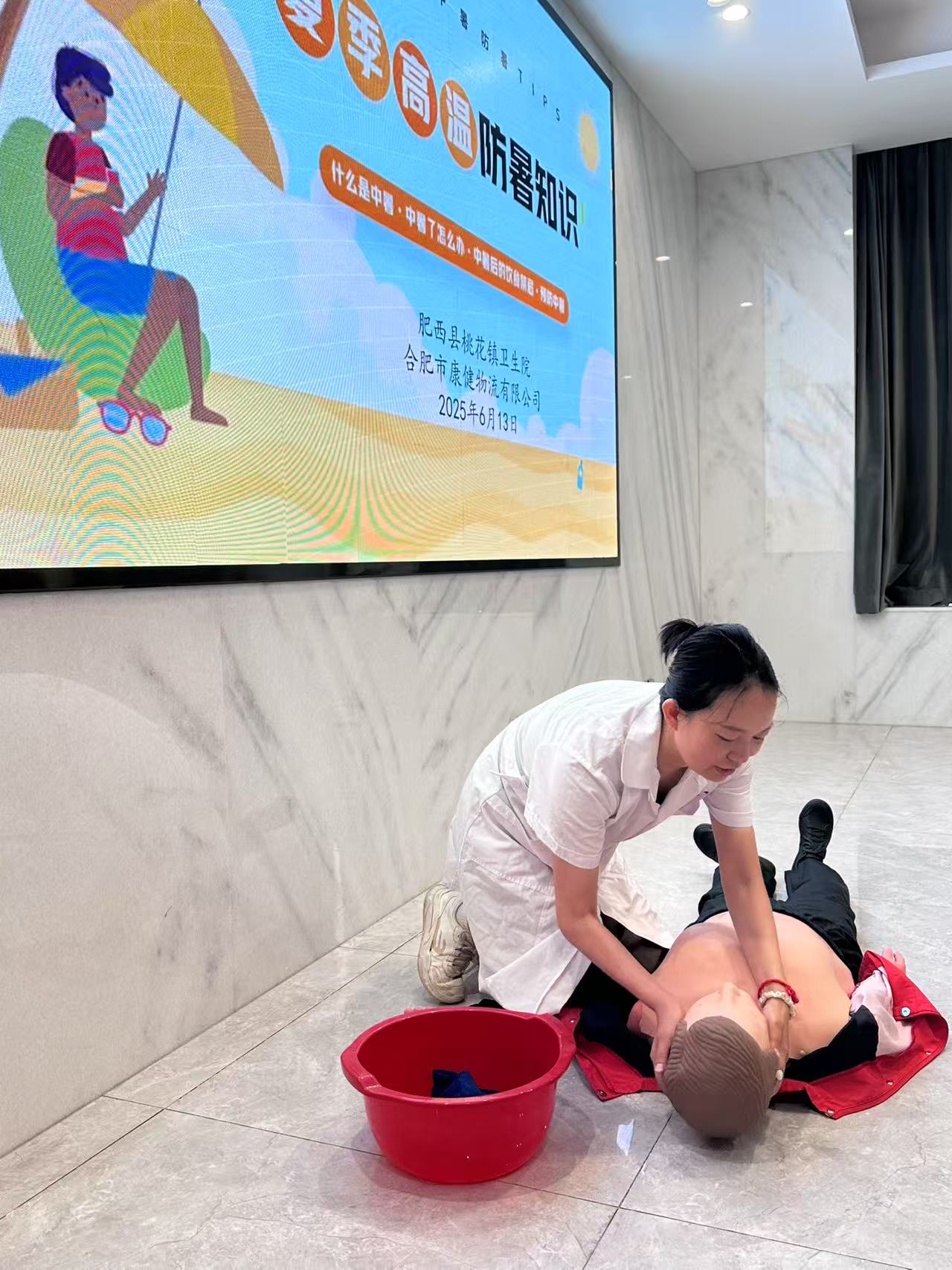 講座現(xiàn)場,肥西縣桃花鎮(zhèn)衛(wèi)生院健康專家程醫(yī)生圍繞中暑防治知識展開專題講座,詳細(xì)講解中暑癥狀、分級及緊急處理措施、科普高溫作業(yè)防護(hù)要點(diǎn),并重點(diǎn)分享了中暑與熱射病的關(guān)鍵區(qū)別與預(yù)防,幫助一線員工提高自我保護(hù)意識?,F(xiàn)場設(shè)置了“中暑急救模擬操作”環(huán)節(jié),程醫(yī)生演示直觀生動,倉儲部員工上臺進(jìn)行了實(shí)踐練習(xí),進(jìn)一步強(qiáng)化了中暑應(yīng)急的處置能力。