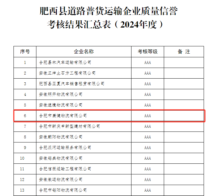 熱烈祝賀康健物流獲得肥西縣道路普貨運(yùn)輸企業(yè)質(zhì)量信譽(yù)考核AAA等級(jí)評(píng)定